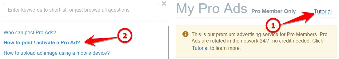 When you're there, click Tutorial (arrow 1 below), then click How to post / activate a Pro Ad? (arrow 2). Follow the instructions there to set up your Pro Ad.